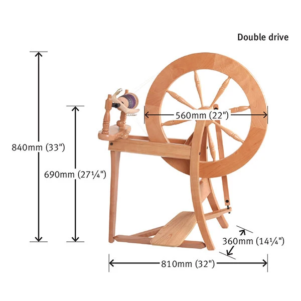 The most popular spinning wheel in the world. Why is it so popular? The separate drive band and bobbin brake adjustment is easy to understand and simple to operate. The bobbins are quick and easy to change. Scotch tension and 4 speed flyer allow for a wide variety of yarn to be spun. Horizontal adjustment of the maiden bar allows perfect alignment with the 4 speed whorl.