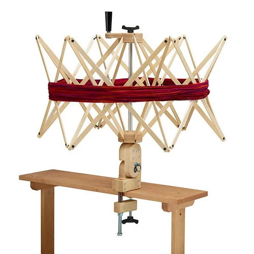 The Ultra Umbrella Swift is ingeniously designed to fit most tables. The Ultra turns freely on ball bearings and can be used vertically or horizontally. The wooden umbrella swift expands downward from the top to hold skeins up to 93″ in circumference.